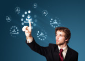 Biznesmen wciskający nowoczesne przyciski typu high tech