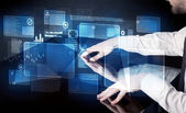 Biznesmen wciskający nowoczesne przyciski typu high tech