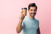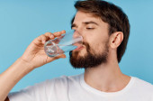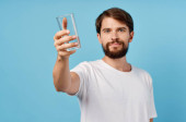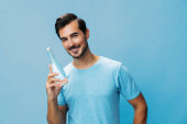 mężczyzna ręka gospodarstwa niebieski woda świeży uśmiech odizolowany atrakcyjny portret tło sexy butelka studio t-shirt napój sport szczęśliwy wesoły picie styl życia zdrowy