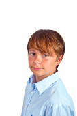 portret ładny chłopiec z shirt pomarańczowy