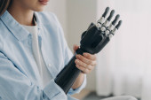Zbliżenie dziewczyny z bioniczną ręką ćwiczącą na macie treningowej podczas treningu sportowego