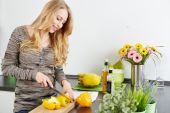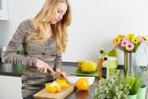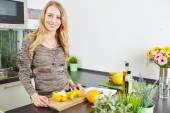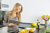 blond kobieta przy użyciu komputera typu tablet do gotowania