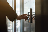 Kobieta otwierający numer garnituru z kartą kontaktową, zbliżenie zdjęcie