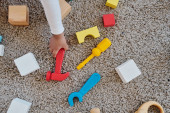 przycięty strzał, dziewczyna z protezą nogi siedzi na dywanie i bawi się drewnianymi klockami w pobliżu matki