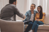 Zdjęcie "Pomyślna koncepcja umowy. Portret tysiącletniej pary kupującej nowe mieszkanie, uścisk dłoni z profesjonalnym agentem nieruchomości. Uśmiechnięty menedżer w garniturze Sprzedam mieszkanie do szczęśliwej młodej rodziny" może być wykorzystywane do celów osobistych i komercyjnych zgodnie z warunkami zakupionej licencji Royalty-free. Obraz jest dostępny do pobrania w jakości wysokiej rozdzielczości do 5760x3840.