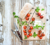 Sałatka z rukoli, pomidory cherry, nasiona słonecznika i zioła na białe ceramiczne płytki nad rustykalnym drewna tło, widok z góry