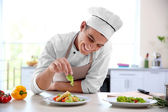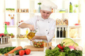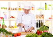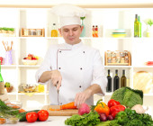 Człowiek przy stole z różnych produktów i szkło w kuchni na ścianie białe tło