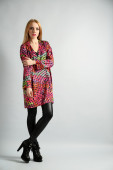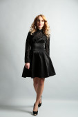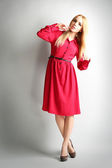 Piękna młoda kobieta w sukni koloru pozowanie na jasnym tle