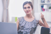 atrakcyjny dziewczynka kaukaski, siedząc na podłodze