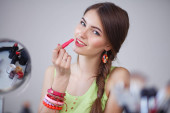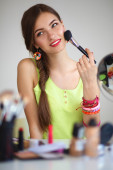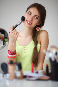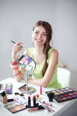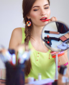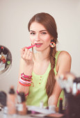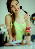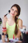 Młoda kobieta piękne Dokonywanie makijaż w pobliżu lustro, siedząc przy biurku