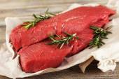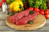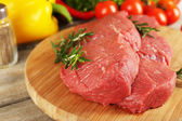 Surowy befsztyk na deski do krojenia warzyw i przypraw na drewniane tła