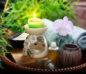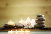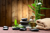 Kompozycja spa kamienie, soli morskiej i masaż torby na drewnianym stole, na jasny kolor tła