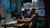 Menedżer nadzorujący centrum danych, uruchamiający kod na laptopie, rozwiązujący problemy i modernizujący zaawansowaną technologicznie infrastrukturę przeznaczoną do obsługi serwerów, systemów sieciowych i macierzy pamięci masowej