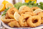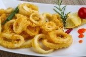 Smażone kalmary pierścienie podawane z sosem