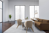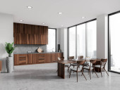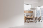 Wnętrze nowoczesnej kuchni z białymi i beżowymi ścianami, betonową podłogą, beżowymi szafkami i szafkami, stołem jadalnym z szarymi krzesłami i przestrzenią do kopiowania po prawej stronie. 3d renderowanie