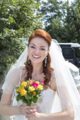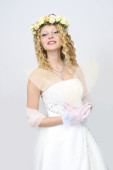 Dziewczyna w stroju panny młodej z ramienia podniesiony