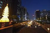 Ludzie chodzą po pracy wzdłuż kanału Cheonggyecheon-ro w Seulu