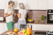 Zdjęcie "radosna kobieta serwująca śniadanie w pobliżu męża z sokiem pomarańczowym w kuchni, wolny od dzieci styl życia" może być wykorzystywane do celów osobistych i komercyjnych zgodnie z warunkami zakupionej licencji Royalty-free. Obraz jest dostępny do pobrania w jakości wysokiej rozdzielczości do 5760x3840.