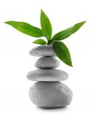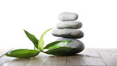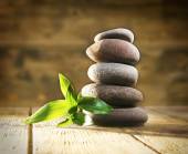 Stos kamieni spa z zielonych liści na niebieskim tle