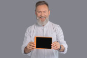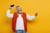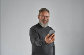 mylić dobrze wyglądający dojrzały mężczyzna w żywe ubrania trzymając telefon i patrząc w aparat fotograficzny, baner