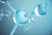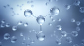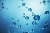 Kolorowe cząsteczki szkła 3D i atomy w niebieskim tle.