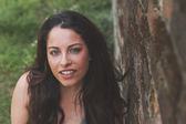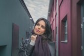 Piękna dziewczyna pozuje w kontekście miejskim