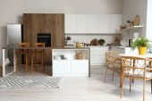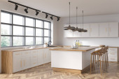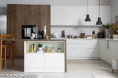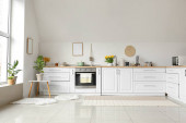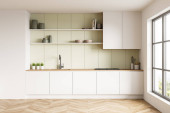 Zdjęcie "Wnętrze jasnej kuchni z białymi licznikami, półką, zlewem i naczyniami" może być wykorzystywane do celów osobistych i komercyjnych zgodnie z warunkami zakupionej licencji Royalty-free. Obraz jest dostępny do pobrania w jakości wysokiej rozdzielczości do 5760x3840.