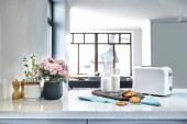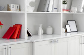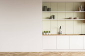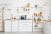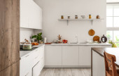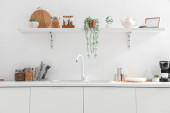 Wnętrze jasnej kuchni z białymi licznikami, półką, zlewem i naczyniami