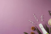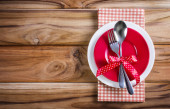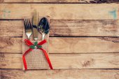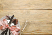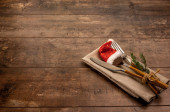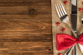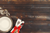 Widok z góry świąteczne ustawienie stołu na tle drewna. Miejsce na tekst