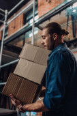 bizneswoman w garniturze i usłyszał kapelusz trzymając kawę, aby przejść do magazynu, zarządzanie logistyką