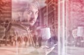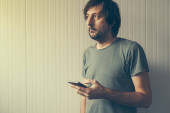 Mężczyzna czytanie złe wieści na komputer cyfrowy tablicowy