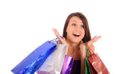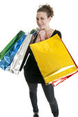 młoda kobieta w czerwonym Boże Narodzenie odzież z dużą ilością pudełko