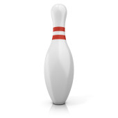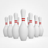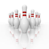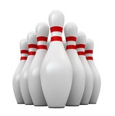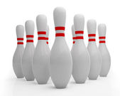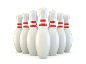 Kręgle z czerwone paski, pogrupowane i na białym tle. Widok z przodu