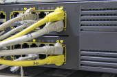 Przełącznik sieciowy Gigabit Smart PoE z podłączonymi kablami sieciowymi testowany na biurku