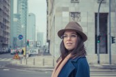 Piękna dziewczyna pozuje w kontekście miejskim