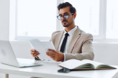 Koszula człowiek laptop szczęśliwy uśmiech biuro garnitur dokument pracownik firma dorosły sukces planowanie biznesmen gospodarstwa technologii papieru