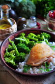 Smażony łosoś z brązowego ryżu, szpinak i strączkowe fasola nerek
