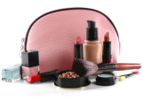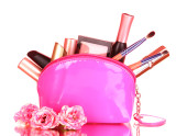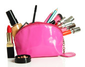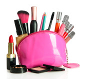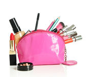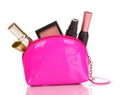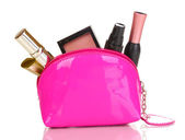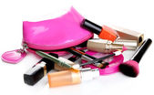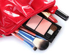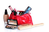 torba piękny czerwony makijaż i kosmetyki na białym tle