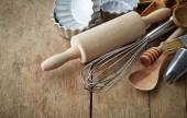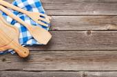 Zestaw naczynia kuchenne w rękawica na drewniane tła