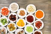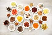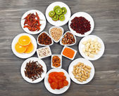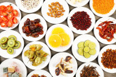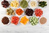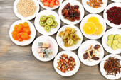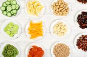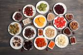 Zdjęcie "różne produkty na talerze na drewnianym stole, widok z góry" może być wykorzystywane do celów osobistych i komercyjnych zgodnie z warunkami zakupionej licencji Royalty-free. Obraz jest dostępny do pobrania w jakości wysokiej rozdzielczości do 5760x3840.