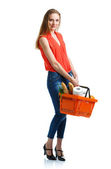 Szczęśliwa kobieta kosz pełen zdrowej żywności. Zakupy