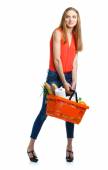 Szczęśliwa kobieta kosz pełen zdrowej żywności. Zakupy