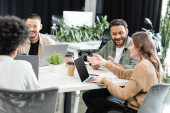 młody człowiek z kawą, aby przejść do omawiania projektu startup ze swoimi kolegami płci męskiej, współpraca