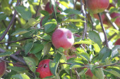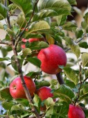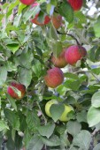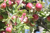 oddział z czerwonych jabłek przeciw błękitne niebo.