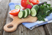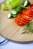 Zdjęcie "Ogórki i pomidory na pokładzie cięcia " może być wykorzystywane do celów osobistych i komercyjnych zgodnie z warunkami zakupionej licencji Royalty-free. Obraz jest dostępny do pobrania w jakości wysokiej rozdzielczości do 5760x3840.