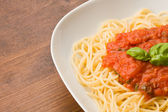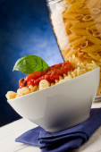 makaron z sosem pomidorowym i bazylią na niebieskim tle