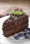 Smaczny kawałek ciasto czekoladowe z mięty na drewnianym stole tło