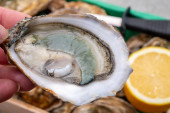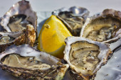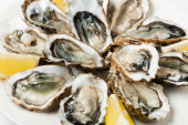 Świeże duże żywe mięczaki francuskie, holenderskie, pacyficzne lub japońskie ostrygi, rozmiar 1, podawane ze świeżą cytryną, surowe owoce morza