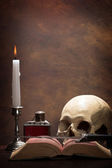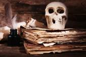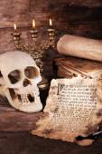 Martwa natura z ludzkiej czaszki, retro książki i świec na drewnianym stole, zbliżenie