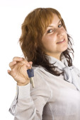 etniczne kobieta z kluczyki do samochodu i dobra ręka znak biały